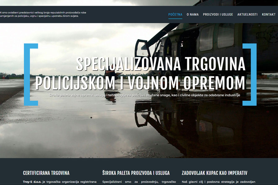 U cilju profesionalne prezentacije njihovih sofisticiranih proizvoda i međunarodnih certifikata, razvijena je moderna web platforma koja na sistematičan način komunicira misiju i ciljeve kompanije. Stranica je dizajnirana da klijentima pruži brz uvid u asortiman robe za specijalne namjene, istovremeno naglašavajući visoke standarde kvaliteta i sigurnosti koje TROY-S zastupa..